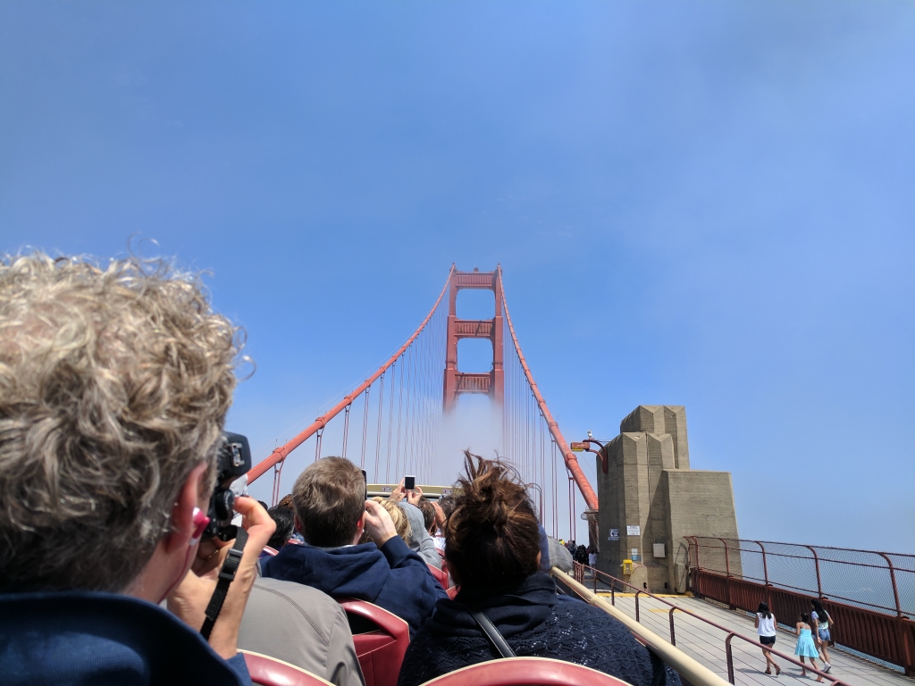 Ok, über die Golden Gate Bridge mit dem Bus zu fahren ist schon ein tolles Erlebnis. Trotz Nebel und kühlem Wind war es beeindruckend. Werde versuchen die Brücke auch noch zu Fuß zu überqueren – sobald die Wettervorhersage passt.
